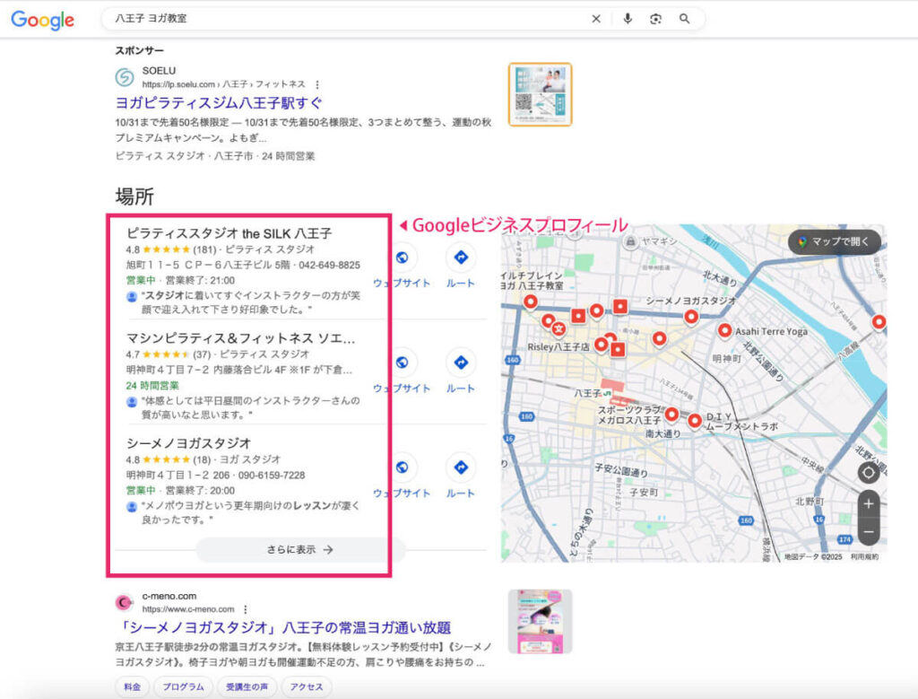 検索結果には、ホームページよりも先にビジネスプロフィールが表示されるので、実店舗を持っている方はビジネスプロフィールへ登録することがおすすめです。