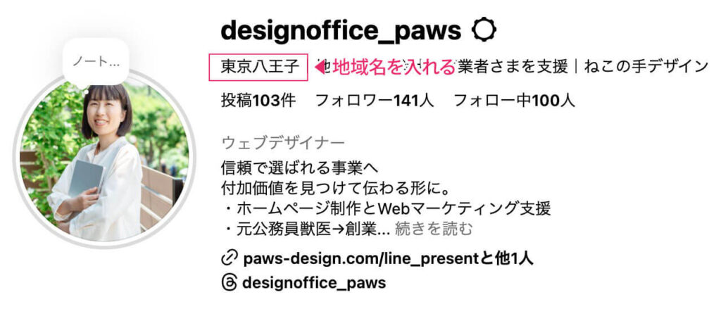 地域密着の事業者さんがインスタグラムを利用するときも、プロフィールに地域名を入れると良いでしょう。
