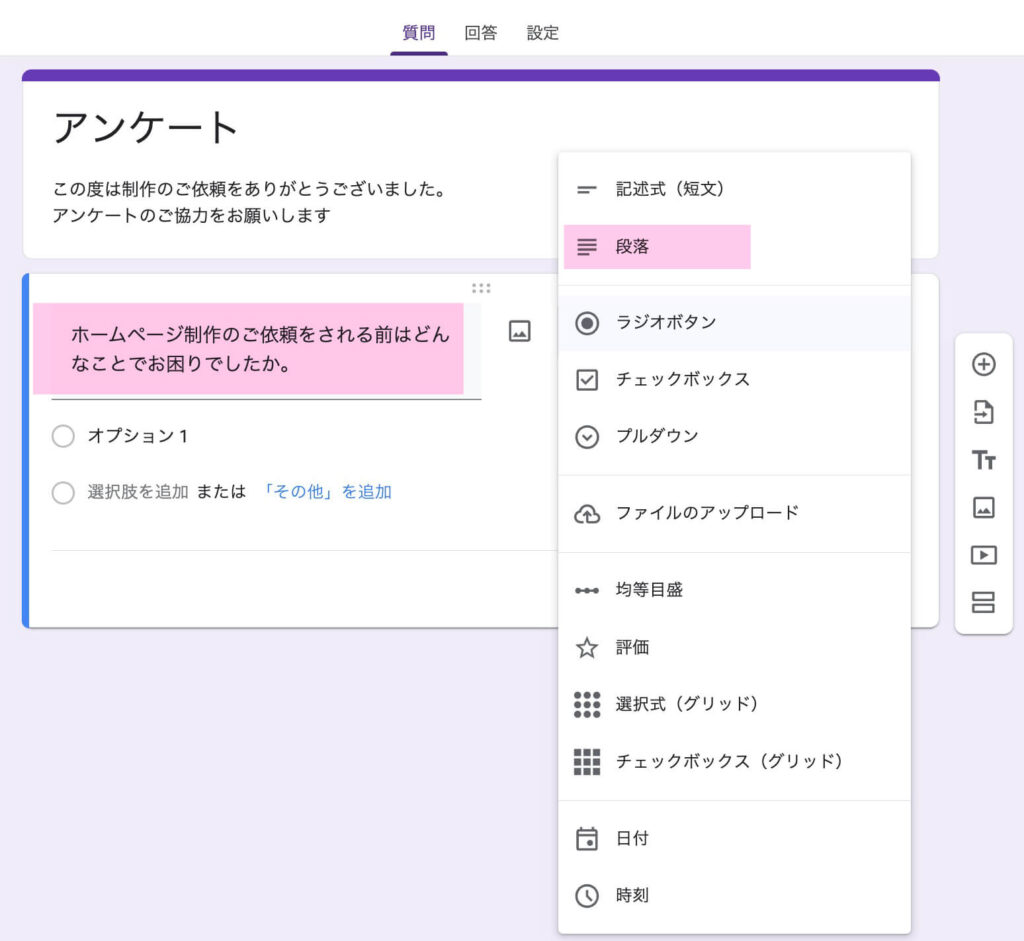 お客さまの回答が数行になりそうな場合は、『段落』を選びましょう。