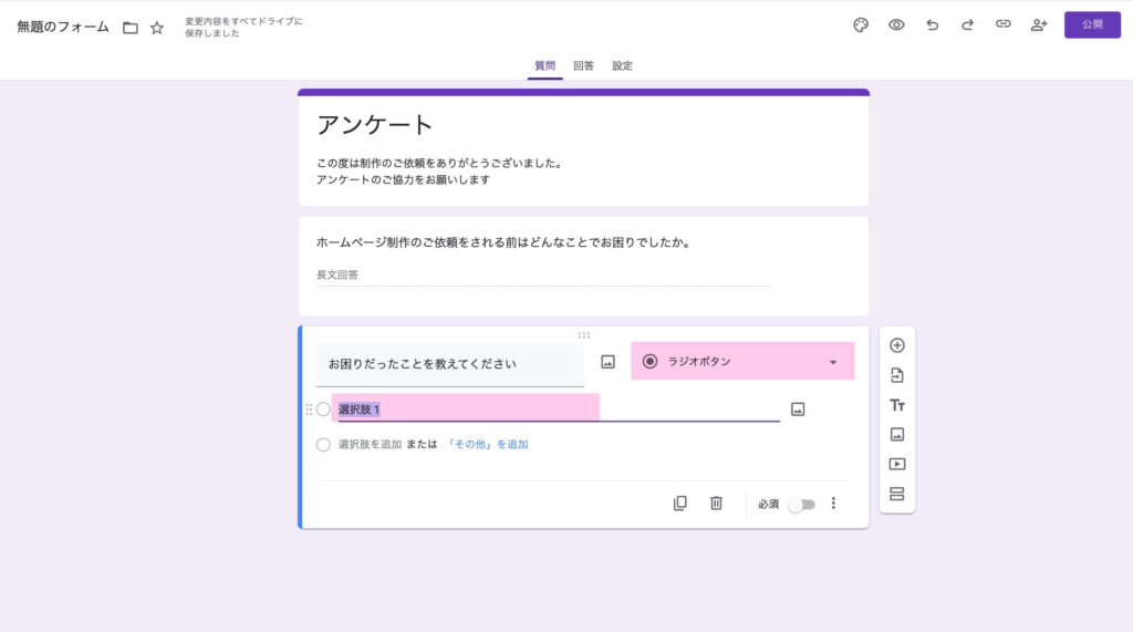 『ラジオボタン』を選んで、選択肢を入力しましょう。