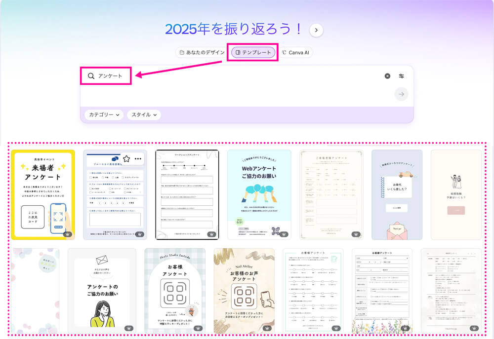 Canvaというデザインソフトを使っている方は、アンケートと検索するとテンプレートが出てきますよ。