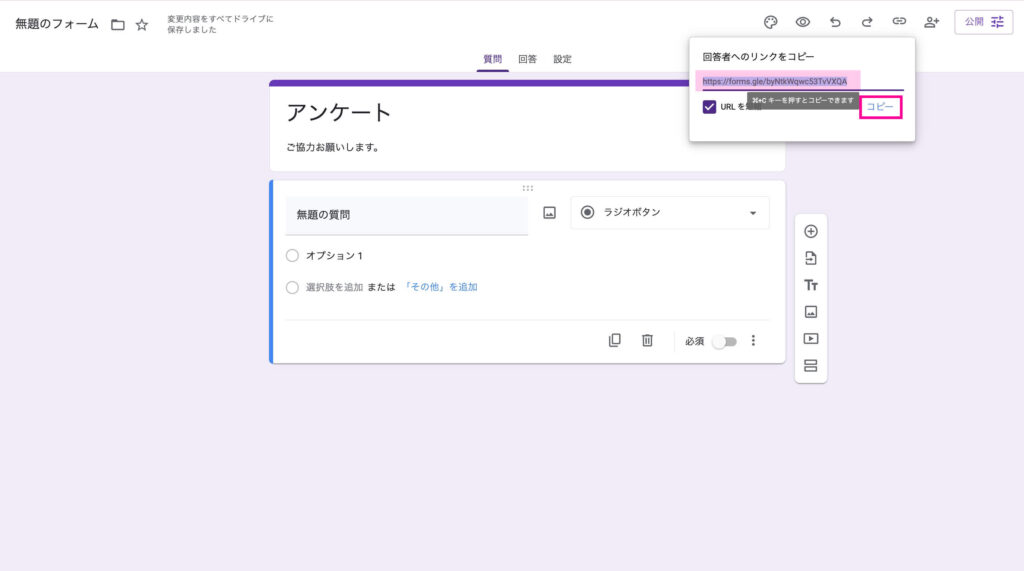 URLを短縮にチェックを入れてから、コピーをクリックします。