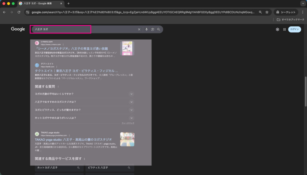 例えば、あなたが料理教室を運営しているなら、「料理教室 八王子」で、ヨガ教室なら「ヨガ 町田」で検索して見ましょう。